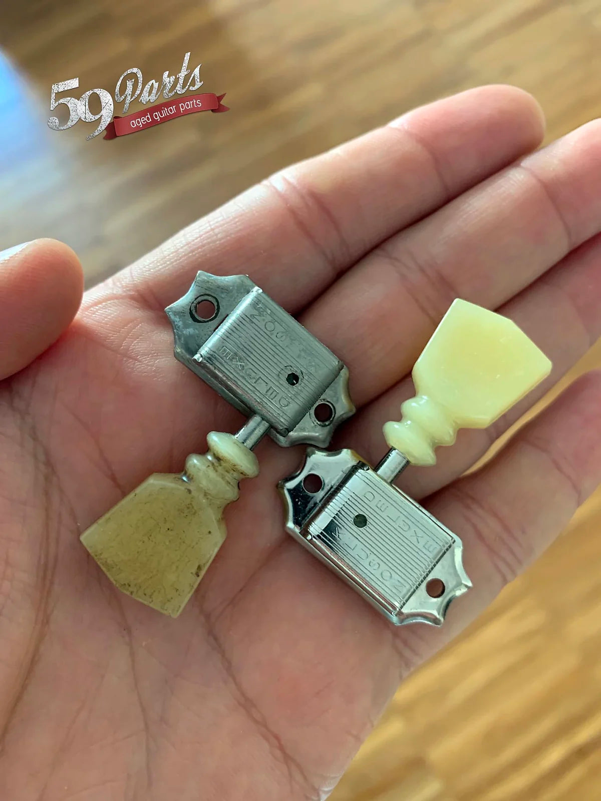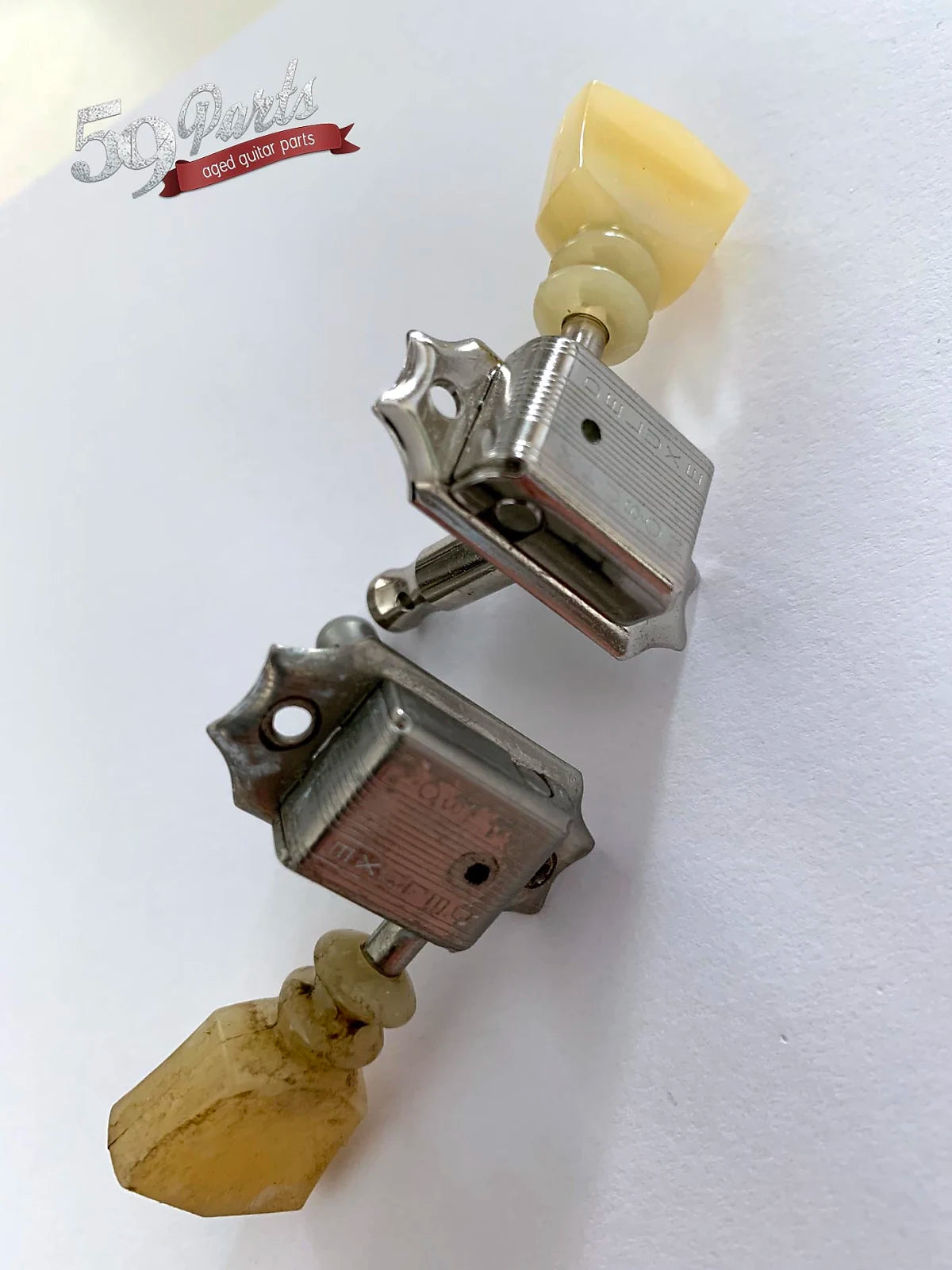 Here is a set of hand aged Kluson Deluxe tuners with double rings by 59 Parts!